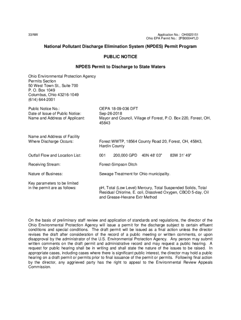 33/Application No.: OH0025151 Ohio EPA Permit No.: 2PB00044×National Pollutant Discharge Elimination System (NODES) Permit Program PUBLIC NOTICE NODES Permit to Discharge to State Waters Ohio Environmental
