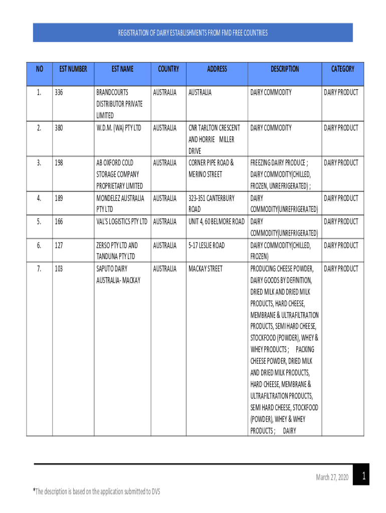 REGISTRATION OF DAIRY ESTABLISHMENTS FROM FMD FREE COUNTRIESNOEST NUMBER1.3362.3803.1984.1895.1666.1277.103EST NAMECOUNTRYADDRESSDESCRIPTIONCATEGORYBRANDCOURTS DISTRIBUTOR PRIVATE LIMITED W.D.M. (WA)