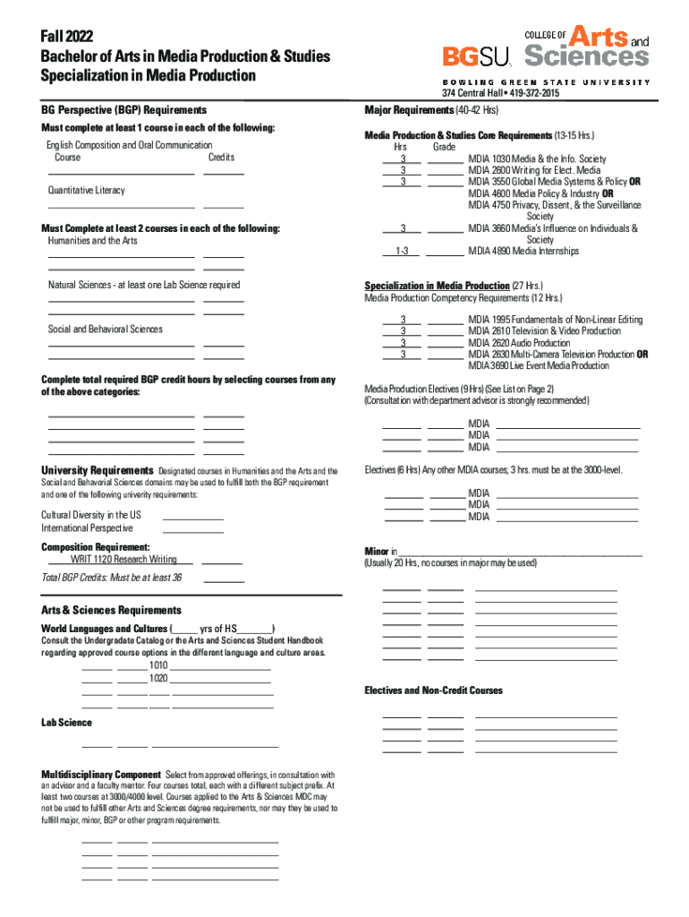 Fall 2022 Bachelor of Arts in Media Production & Studies Specialization in Media Production 374 Central Hall 4193722015BG Perspective (BGP) Requirements Must complete at least 1 course in each of