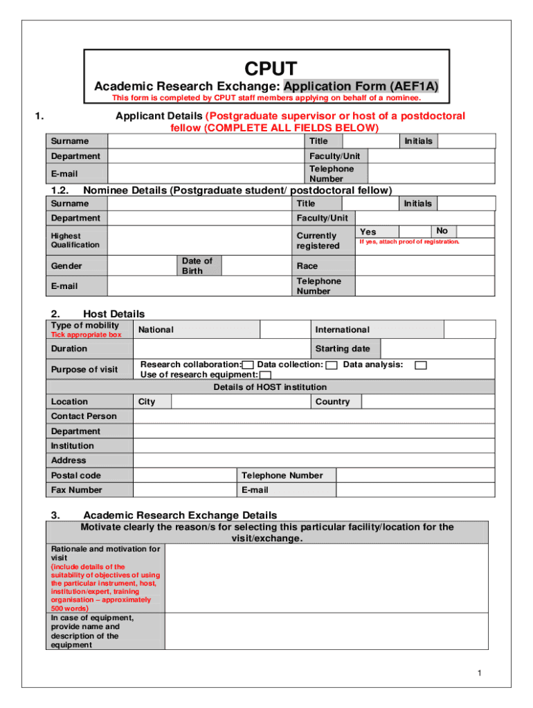 CPUT Academic Research Exchange: Application Form (AEF1A) This form is completed by CPUT staff members applying on behalf of a nominee.1.Applicant Details (Postgraduate supervisor or host of a postdoctoral