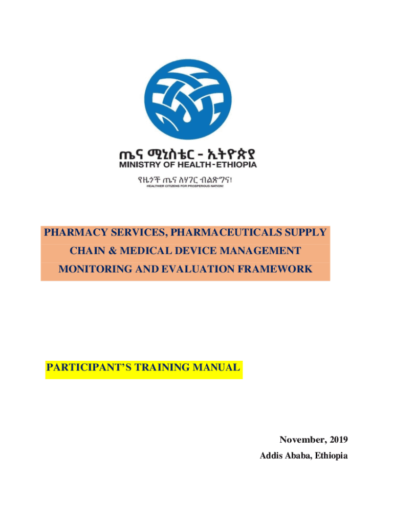 PHARMACY SERVICES, PHARMACEUTICALS SUPPLY CHAIN & MEDICAL DEVICE MANAGEMENT MONITORING AND EVALUATION FRAMEWORKPARTICIPANTS TRAINING MANUAL November 2019 Addis Ababa, EthiopiaAPPROVAL STATEMENT OF