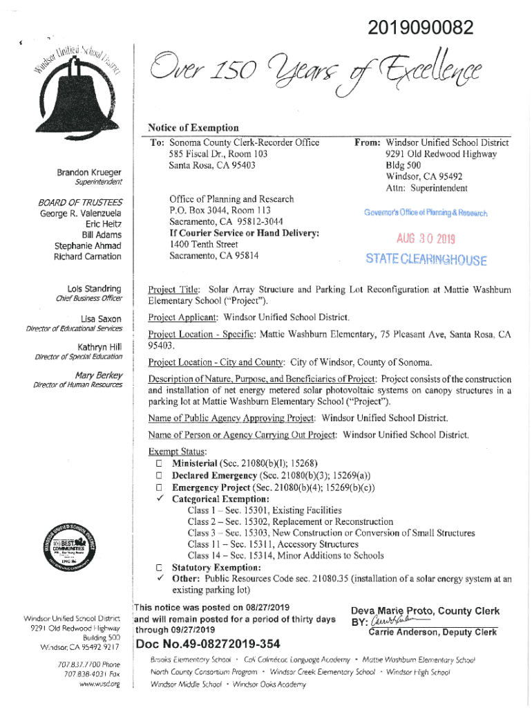2019090082 C\'l Notice of Exemption Brandon Krueger: Sonoma County ClerkRecorder Office 585 Fiscal Dr., Room 103 Santa Rosa, CA 95403SuperintendentBOARD OF TRUSTEES George R. Valenzuela Eric Hat Bill