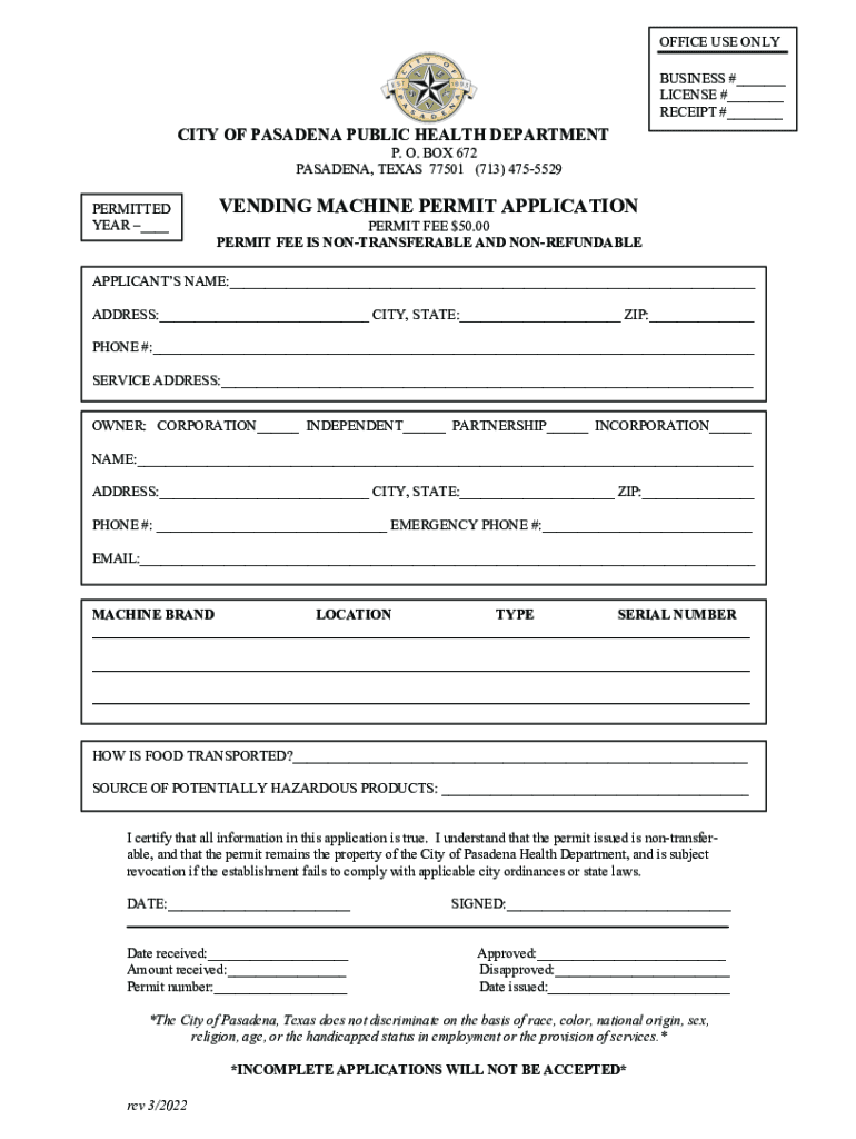 OFFICE USE ONLY BUSINESS #___ LICENSE #___ RECEIPT #___CITY OF PASADENA PUBLIC HEALTH DEPARTMENT P. O. BOX 672 PASADENA, TEXAS 77501 (713) 4755529 PERMITTED YEAR ___ ___VENDING MACHINE PERMIT APPLICATION