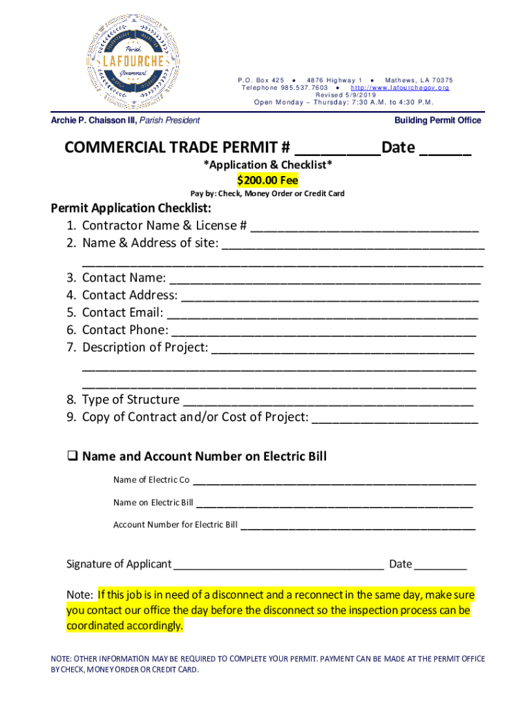 P.O. Box 425 4876 Highway 1 Mathews, LA 70375 Telephone 985.537.7603 http://www.lafourchegov.org Revised 5/9/2019Open Monday Thursday: 7:30 A.M. to 4:30 P.M.Archie P. Caisson III, Parish PresidentBuilding