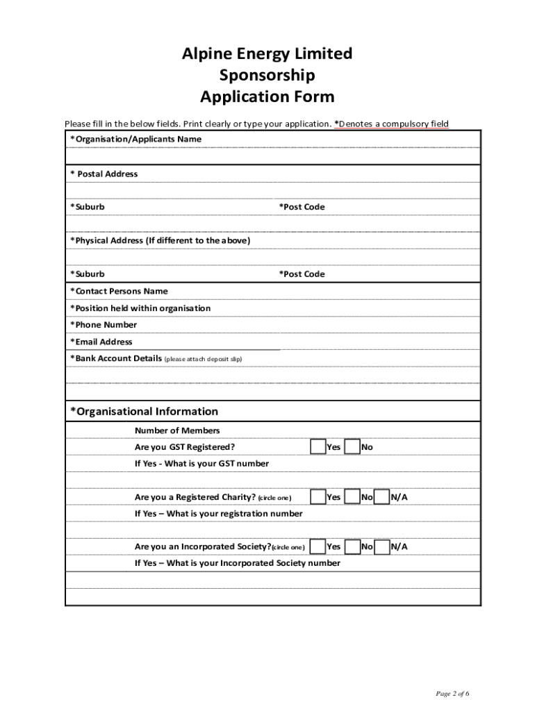 Alpine Energy Limited Sponsorship Application Form Once complete return to any of the followingmailbox@alpineenergy.co.nz Alpine Energy Limited P O Box 530 BIMARU 7940 24 Elginshire Road WashdykePlease