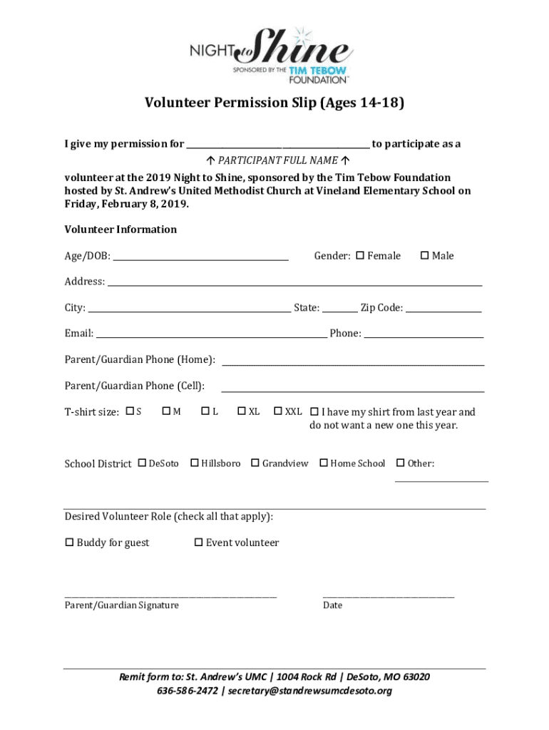 Volunteer Permission Slip (Ages 1418) I give my permission for ___ to participate as a PARTICIPANT FULL NAME volunteer at the 2019 Night to Shine, sponsored by the Tim Te bow Foundation hosted by