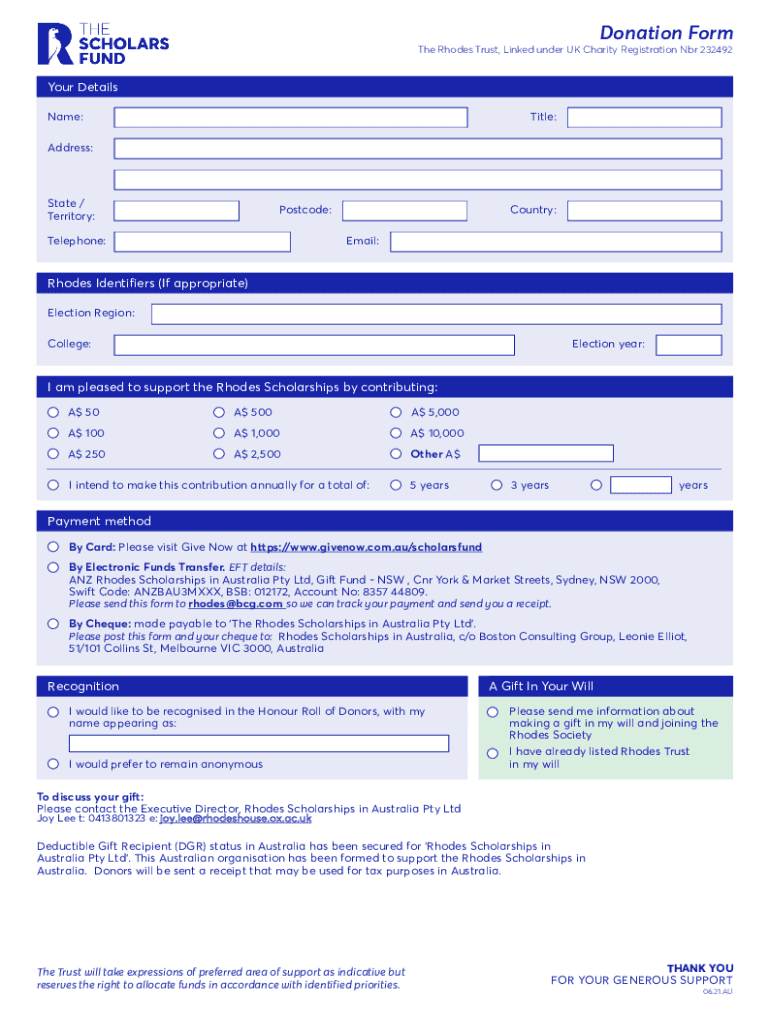 Get the free The Scholars fund - Donation Form Australia. Donation form to support Rhodes Scholar...