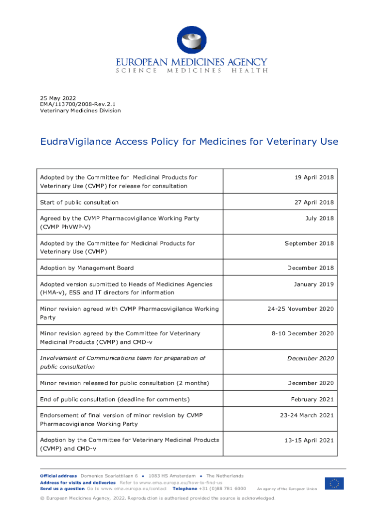 Get the free EudraVigilance Access Policy for Medicines for Veterinary Use. EMA/113700/2008-Rev.2.1