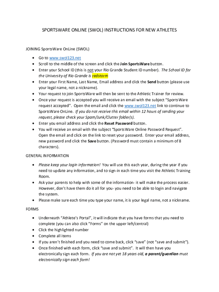 SPORTSWEAR ONLINE (SOL) INSTRUCTIONS FOR NEW ATHLETES JOINING Sportswear Online (SOL) Go to www.swol123.net Scroll to the middle of the screen and click the Join Sportswear button. Enter your School