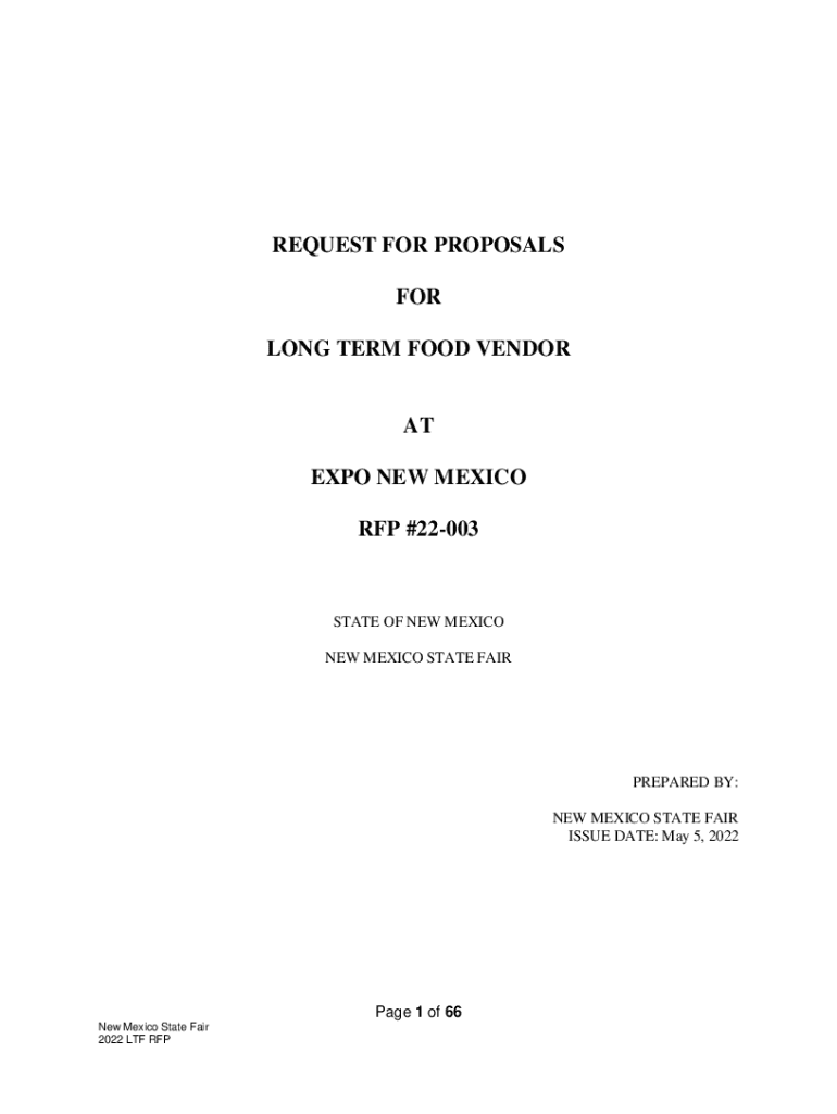 REQUEST FOR PROPOSALS FOR LONG TERM FOOD VENDOR AT EXPO NEW MEXICO RFP #22003STATE OF NEW MEXICO STATE FAIRPREPARED BY: NEW MEXICO STATE FAIR ISSUE DATE: May 5, 2022Page 1 of 66 New Mexico State Fair