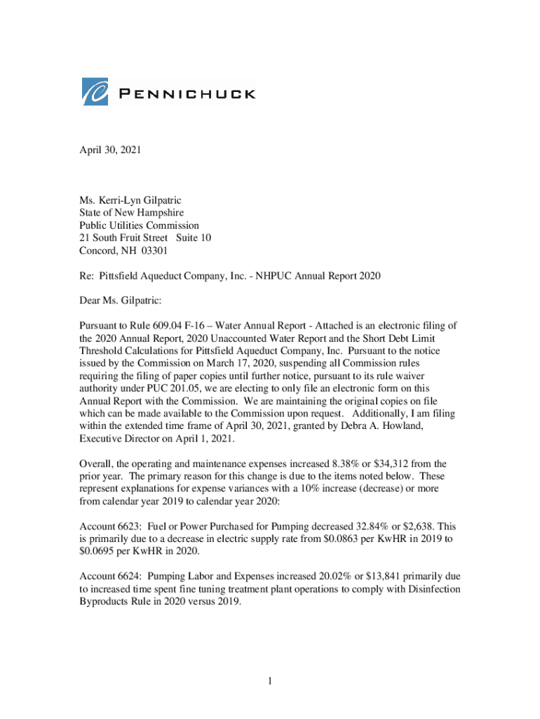 April 30, 2021Ms. Merrily Geriatric State of New Hampshire Public Utilities Commission 21 South Fruit Street Suite 10 Concord, NH 03301 Re: Pittsfield Aqueduct Company, Inc. NH PUC Annual Report 2020