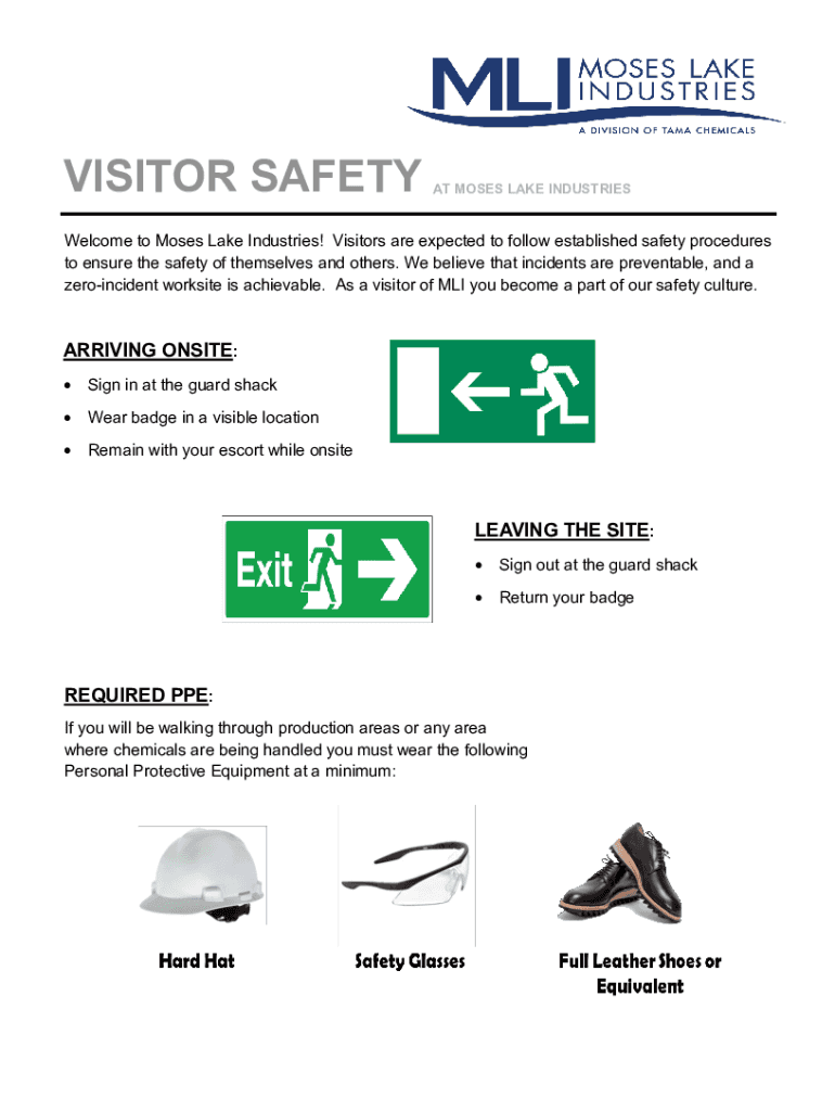 VISITOR SAFETY AT MOSES LAKE INDUSTRIESWelcome to Moses Lake Industries! Visitors are expected to follow established safety procedures to ensure the safety of themselves and others. We believe that