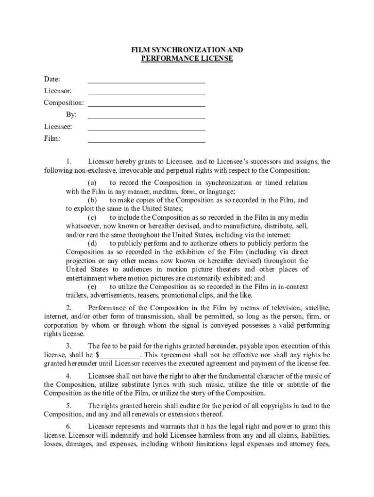 FILM SYNCHRONIZATION AND PERFORMANCE LICENSE Date:___Licensor:___Composition: ___ By:___Licensee:___Film:___1. Licensor hereby grants to Licensee, and to Licensees successors and assigns, the following