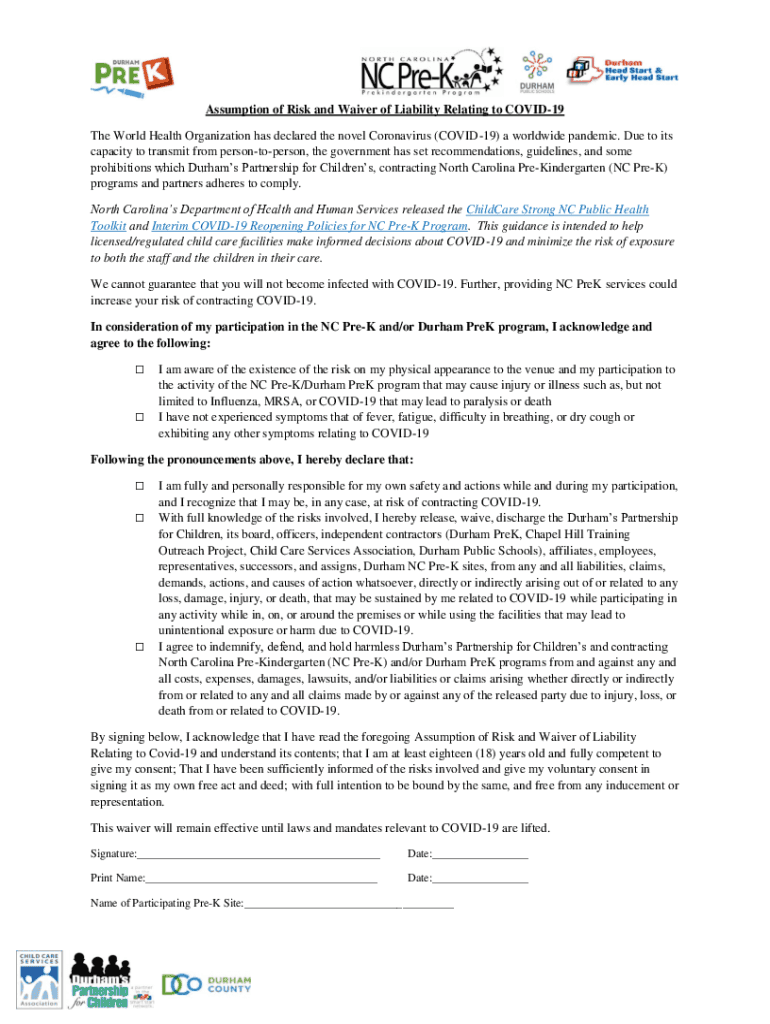 Assumption of Risk and Waiver of Liability Relating to COVID-19 The World Health Organization has declared the novel Coronavirus (COVID-19) a worldwide pandemic. Due to its capacity to transmit from