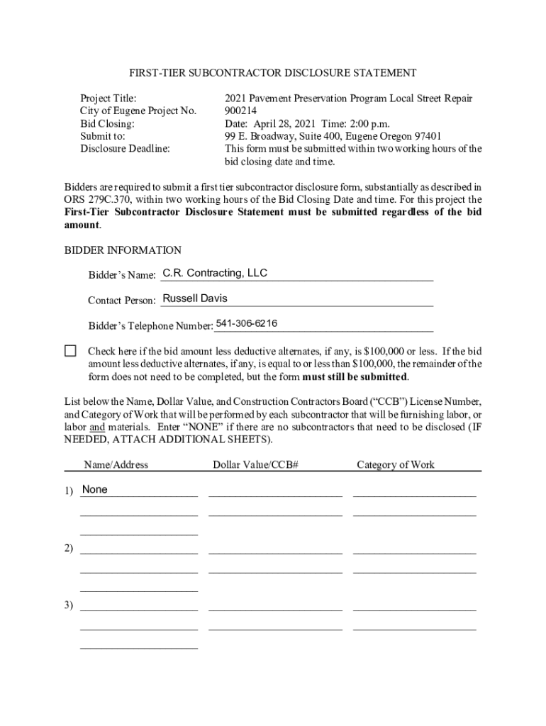 FRONTIER SUBCONTRACTOR DISCLOSURE STATEMENT Project Title: City of Eugene Project No. Bid Closing: Submit to: Disclosure Deadline:2021 Pavement Preservation Program Local Street Repair 900214 Date: