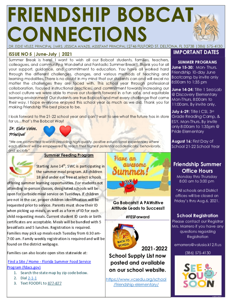 FRIENDSHIP BOBCAT CONNECTION SDR. EDDIE VELEZ, PRINCIPAL |MRS. JESSICA RIVALS, ASSISTANT PRINCIPAL|2746 MILFORD ST. DELTONA, FL 32738 |386) 5754130IMPORTANT DATESISSUE NO 5 |June July | 2021 Summer
