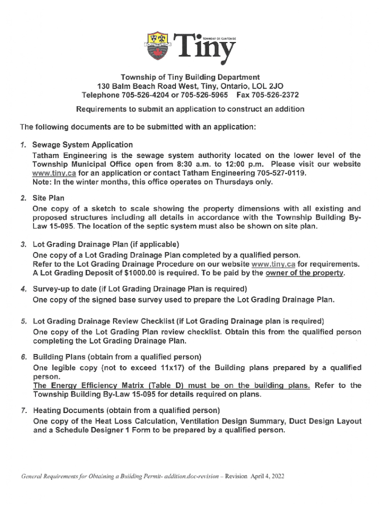 Township OF \'CANTON DAY Township of Tiny Building Department 130 Balm Beach Road West, Tiny, Ontario, LOL 2JO Telephone 7055264204 or 7055265965 Fax 7055262372 Requirements to submit an application