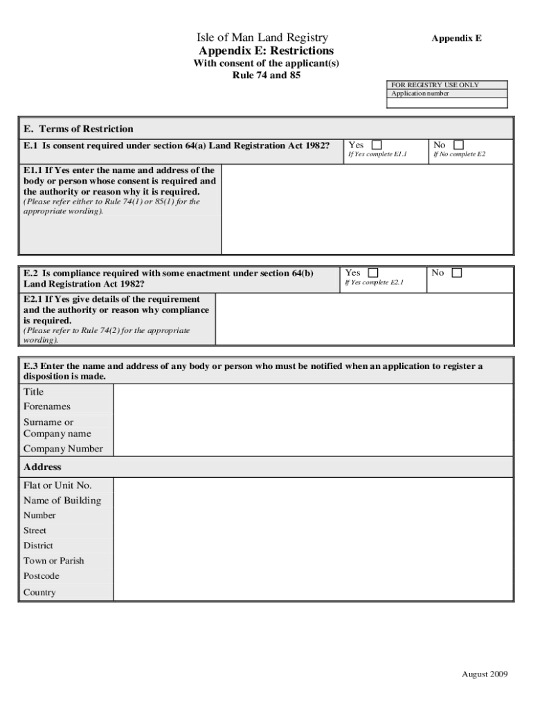 Isle of Man Land Registry Appendix E: RestrictionsAppendix With consent of the applicant(s) Rule 74 and 85 FOR REGISTRY USE ONLY Application number. Terms of Restriction E.1 Is consent required under
