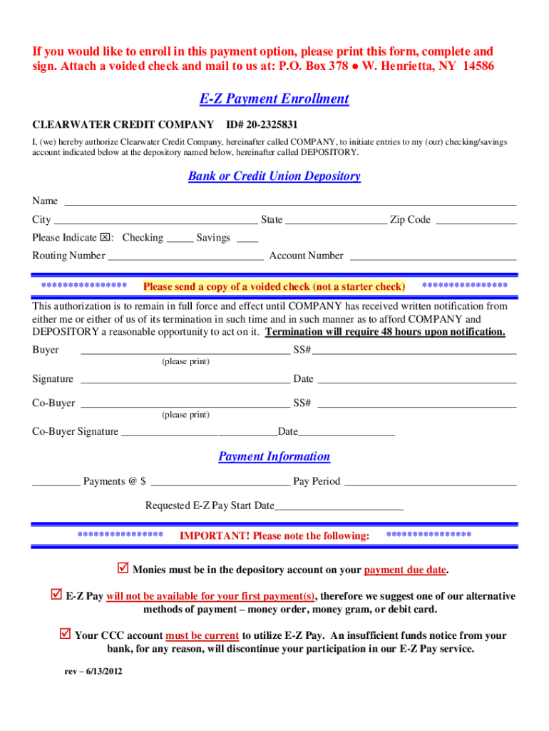 If you would like to enroll in this payment option, please print this form, complete and sign. Attach a voided check and mail to us at: P.O. Box 378 W. Henrietta, NY 14586EZ Payment Enrollment CLEARWATER