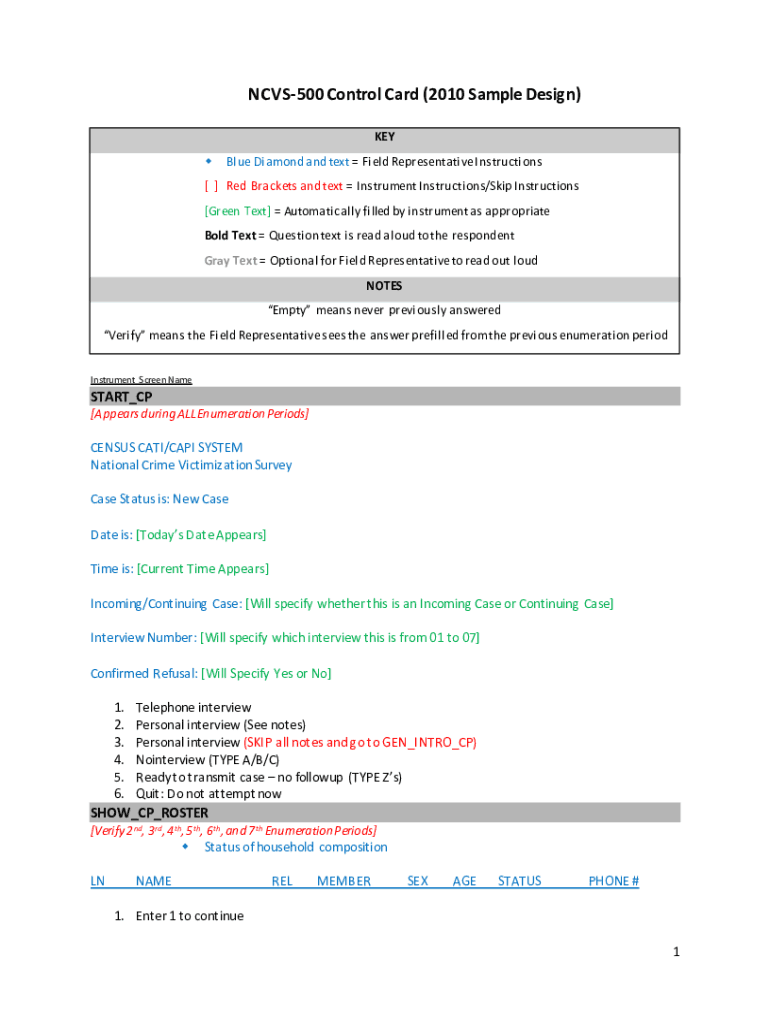 Get the free NCVS-500 Control Card (2010 Sample Design) interview instructions Questionnaire. Sur...