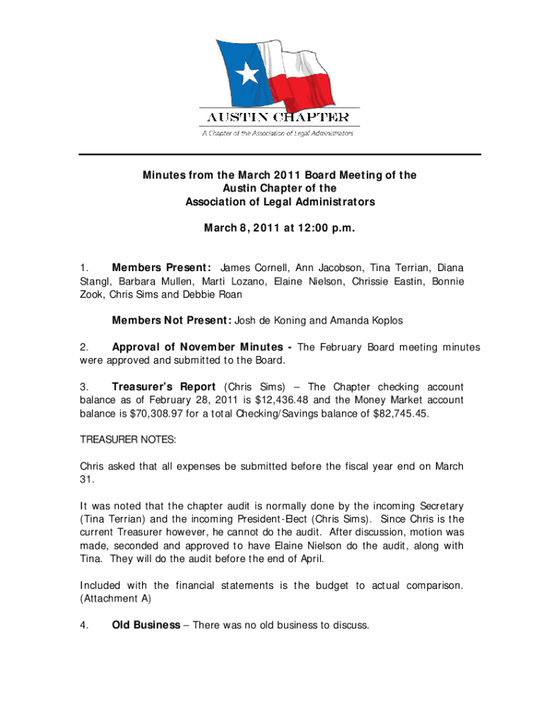 Minutes from the March 2011 Board Meeting of the Austin Chapter of the Association of Legal Administrators March 8, 2011, at 12:00 p.m. 1. Members Present: James Cornell, Ann Jacobson, Tina Terrain,