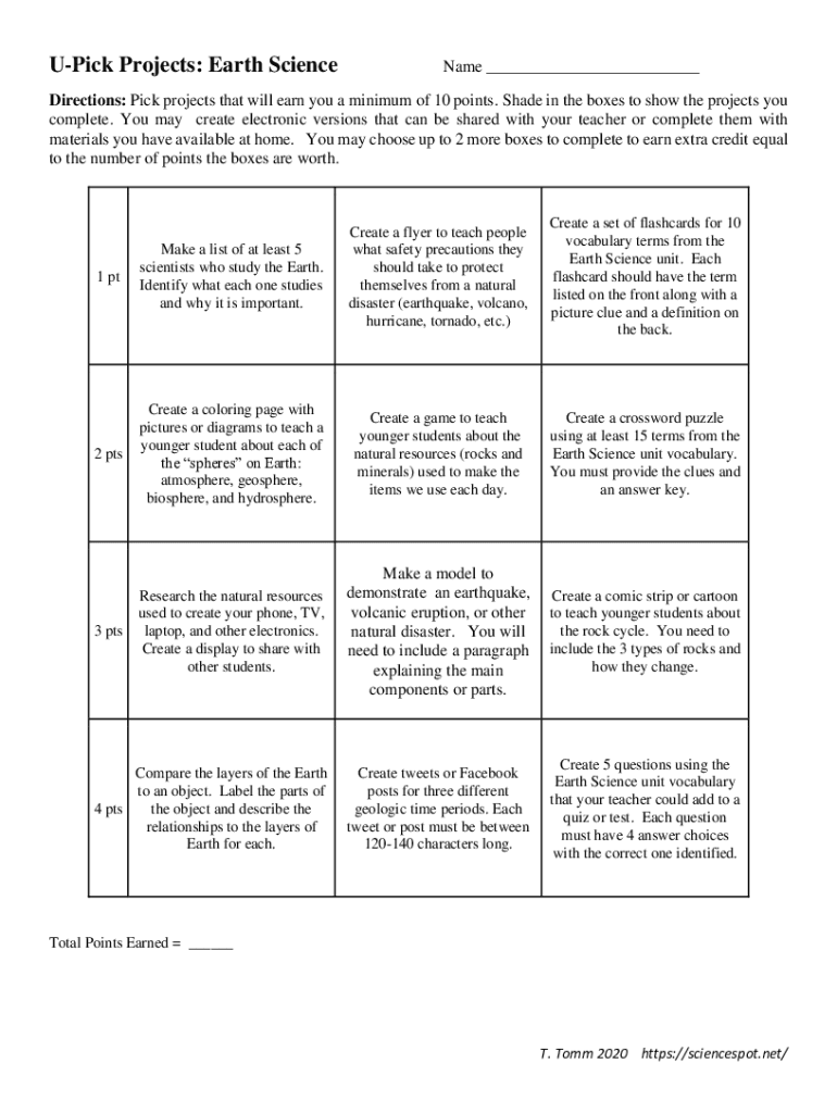 Pick Projects: Earth ScienceName ___Directions: Pick projects that will earn you a minimum of 10 points. Shade in the boxes to show the projects you complete. You may create electronic versions that