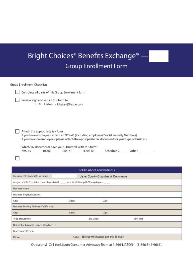 Bright Choices Benefits Exchange 2012 Group Enrollment Form Group Enrollment Checklist: Complete all parts of this Group Enrollment form Review, sign and return this form to: TJ at Lion tj.baker@liazon.com