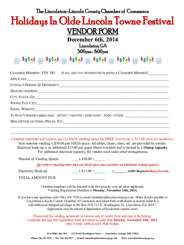The LincolntonLincoln County Chamber of CommerceHolidays In Old Lincoln Town Festival VENDOR FORM December 6th, 2014 Lincolnton, GA 3:00pm 8:00pmCHAMBER MEMBER? YES COIF NO, ARE YOU INTERESTED IN