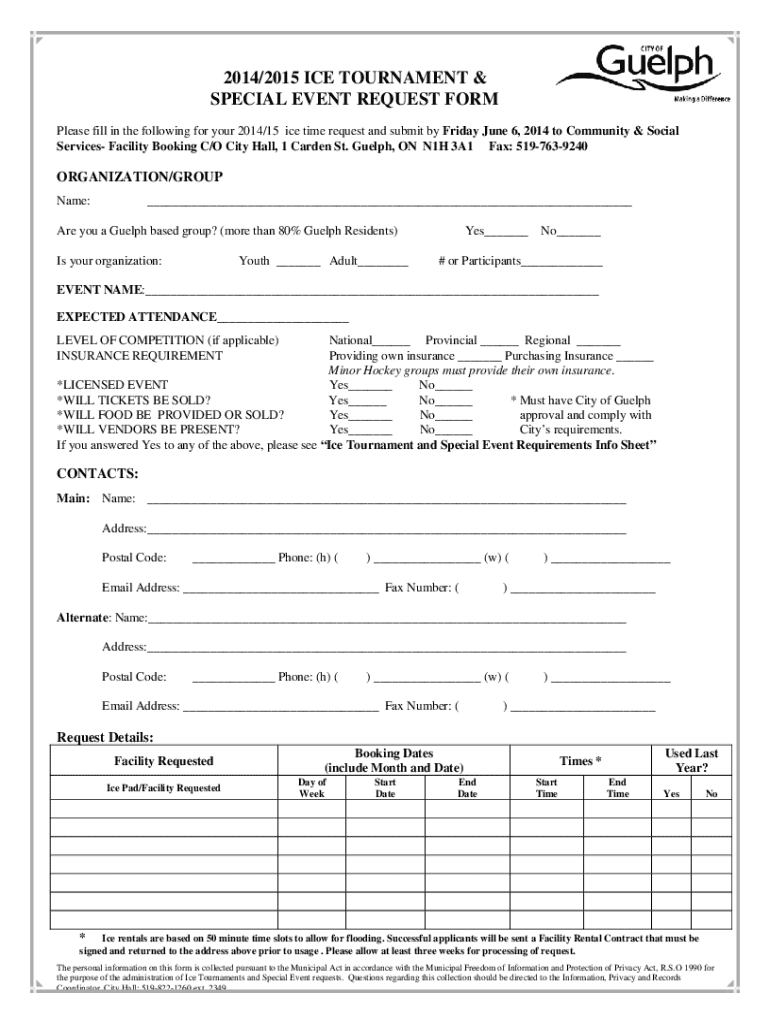 2014/2015 ICE TOURNAMENT & SPECIAL EVENT REQUEST FORM Please fill in the following for your 2014/15 ice time request and submit by Friday, June 6, 2014, to Community & Social Services Facility Booking