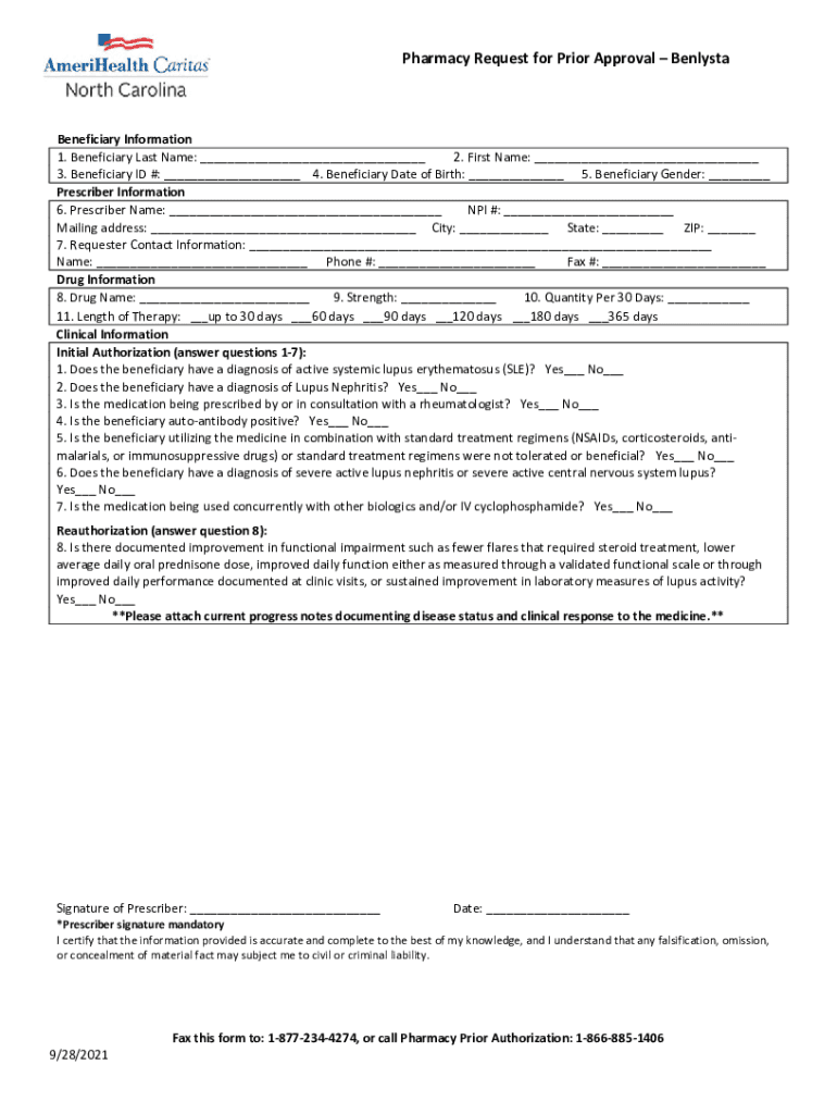 Pharmacy Request for Prior to Approval BenlystaBeneficiary Information 1. Beneficiary Last Name: ___ 2. First Name: ___ 3. Beneficiary ID #: ___ 4. Beneficiary Date of Birth: ___ 5. Beneficiary Gender: