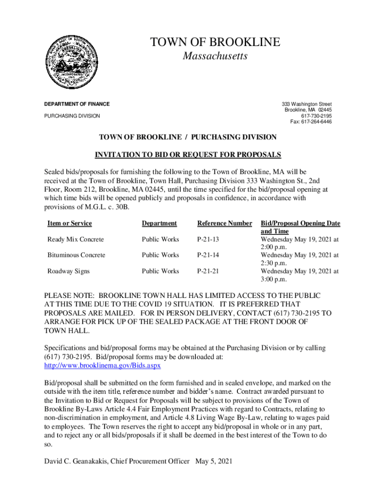 TOWN OF BROOKLINE MassachusettsDEPARTMENT OF FINANCE333 Washington Street Brookline, MA 02445 6177302195 Fax: 6172646446PURCHASING DIVISIONTOWN OF BROOKLINE / PURCHASING DIVISION INVITATION TO BID