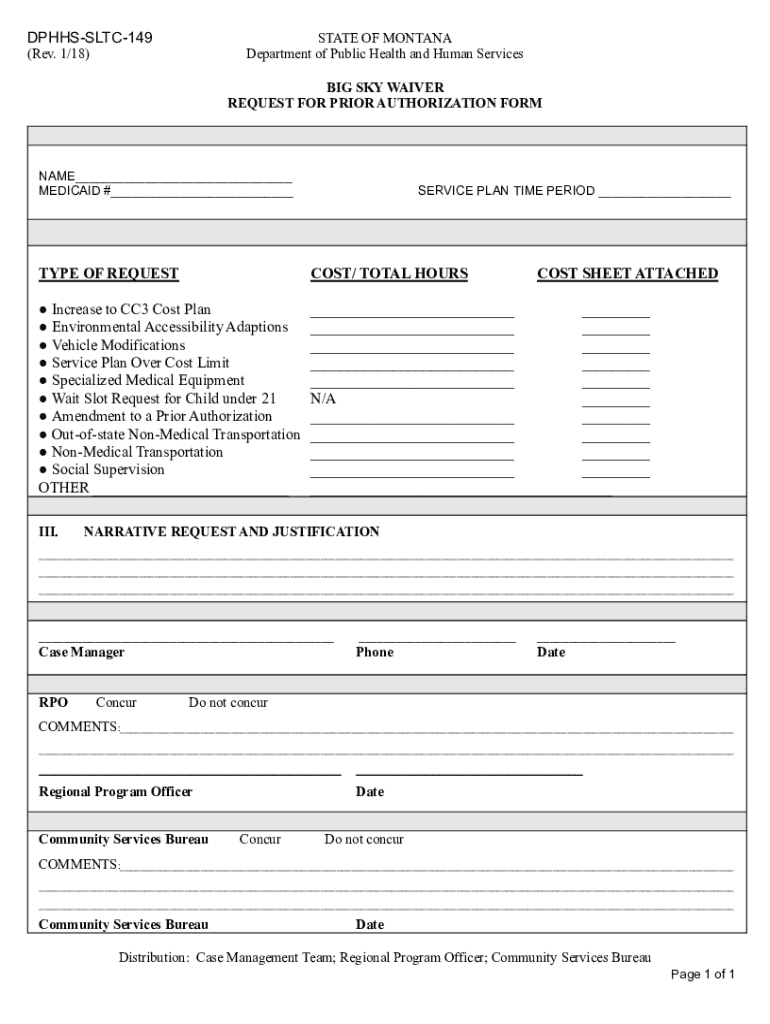 DPHHSSLTC149STATE OF MONTANA Department of Public Health and Human Services(Rev. 1/18)BIG SKY WAIVER REQUEST FOR PRIOR AUTHORIZATION FORMATION 1 MEMBER INFORMATION NAME___ MEDICAID #___SERVICE PLAN