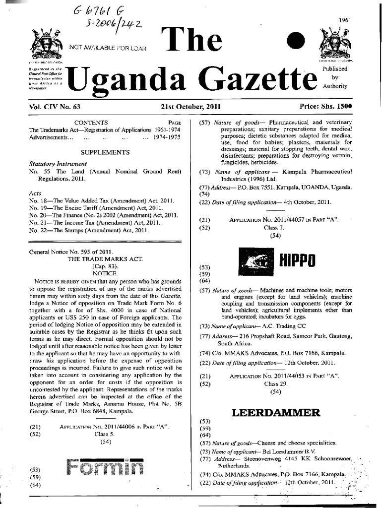 && 1961The Uganda Gazette NOT AVAILABLE FOR LOATHE REPUBLIC OF UGANDARegistered at Ike\” w\” j21st October, 2011Vol. CIV No. 63CONTENTS Page The Trademarks Registration of Applications 19611974