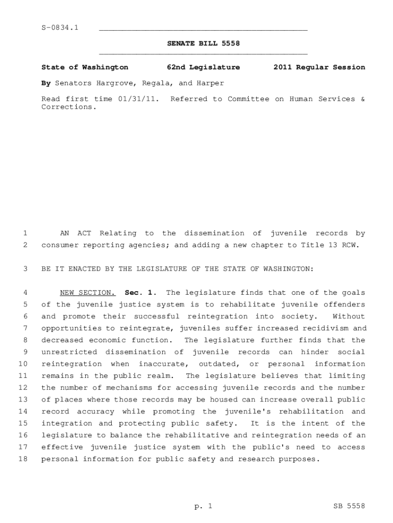S0834.1___ SENATE BILL 5558 ___State of Washington62nd Legislature2011 Regular Session Senators Hargrove, Regal, and Harper Read first time 01/31/11. Corrections. Referred to Committee on Human Services
