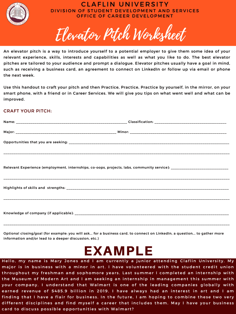 CHAPLIN UNIVERSITYDIVISION OF STUDENT DEVELOPMENT AND SERVICES OFFICE OF CAREER DEVELOPMENTElevator Pitch Worksheet An elevator pitch is a way to introduce yourself to a potential employer to give