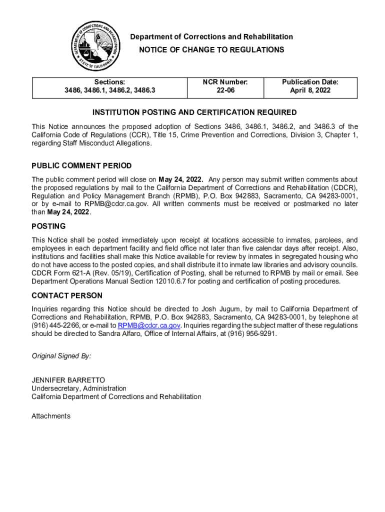 Department of Corrections and Rehabilitation NOTICE OF CHANGE TO REGULATIONSSections: 3486, 3486.1, 3486.2, 3486.3NCR Number: 2206Publication Date: April 8, 2022INSTITUTION POSTING AND CERTIFICATION
