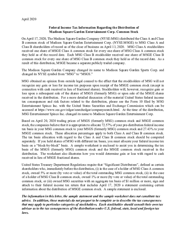 April 2020 Federal Income Tax Information Regarding the Distribution of Madison Square Garden Entertainment Corp. Common Stock On April 17, 2020, The Madison Square Garden Company (NYSE:MSG) distributed