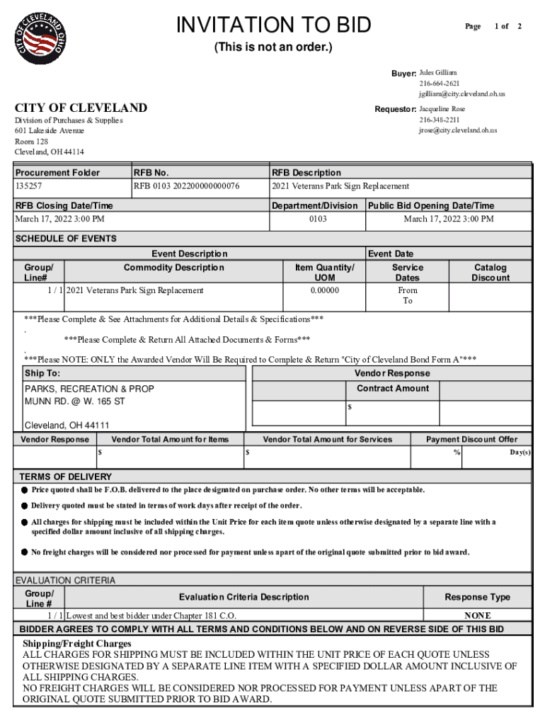 INVITATION TO BIDPage1 of2(This is not an order.) Buyer: Jules Gilliam 2166642621 jgilliam@city.cleveland.oh.usCITY OF CLEVELANDRequestor: Jacqueline Rose 2163482211 jrose@city.cleveland.oh.usDivision