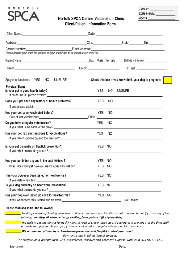 How to fill out VA Norfolk SPCA Canine Vaccination Clinic