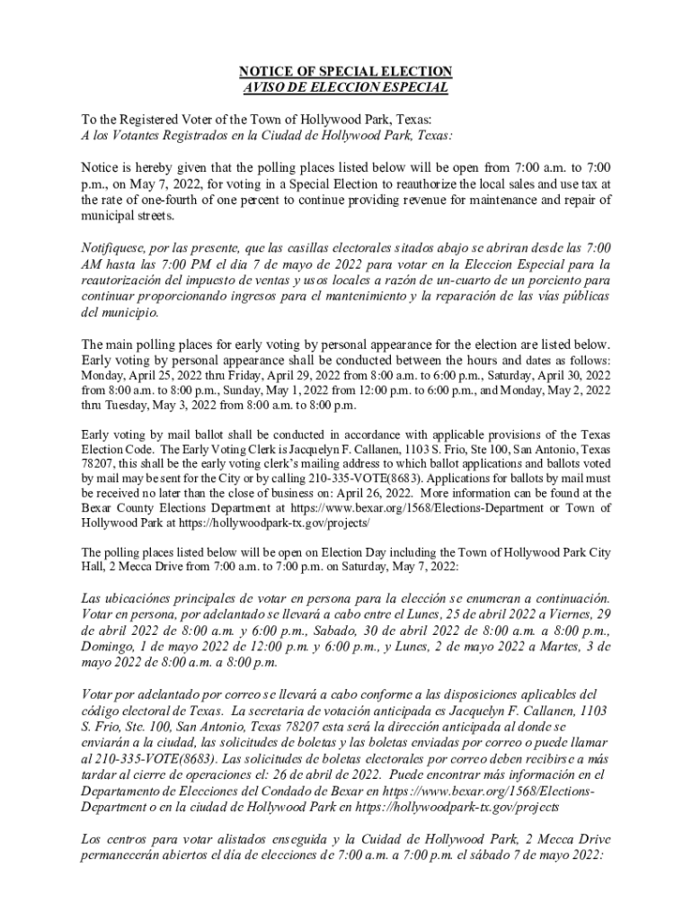 NOTICE OF SPECIAL ELECTION AVIS ODE ELECTION ESPECIAL To the Registered Voter of the Town of Hollywood Park, Texas: A Los Rotates Registrants en la Ciudad de Hollywood Park, Texas: Notice is hereby
