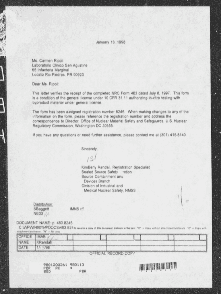 .........! 2dVW y,.,’s!in* January 13,1998k5 D.: LMS. Carmen Poll Lab oratorio Clinic San Augustine 65 Infantry Marginal Localize Rio Piers, PR 00923.1 .idea Ms. Poll:This letter verifies the receipt