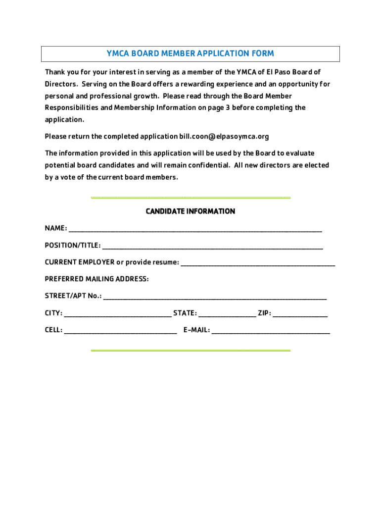 YMCA BOARD MEMBER APPLICATION FORM Thank you for your interest in serving as a member of the YMCA of El Paso Board of Directors. Serving on the Board offers a rewarding experience and an opportunity