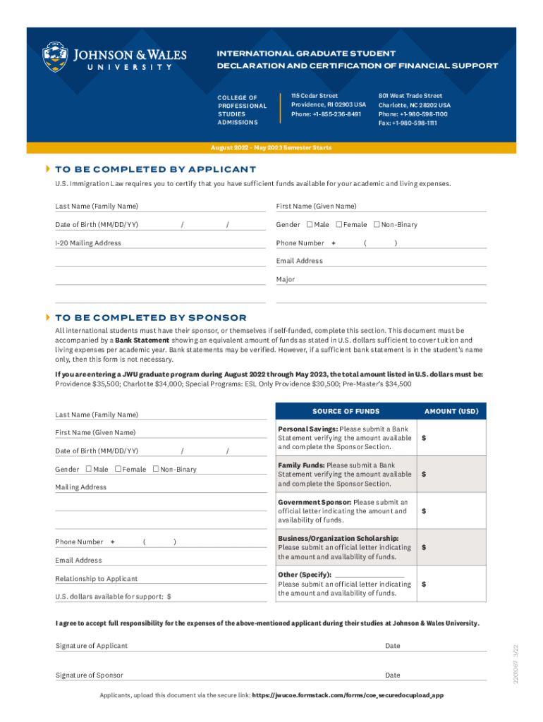 INTERNATIONAL GRADUATE STUDENT DECLARATION AND CERTIFICATION OF FINANCIAL SUPPORT115 Cedar Street Providence, RI 02903 USA Phone: +18552368491COLLEGE OF PROFESSIONAL STUDIES ADMISSIONS801 West Trade