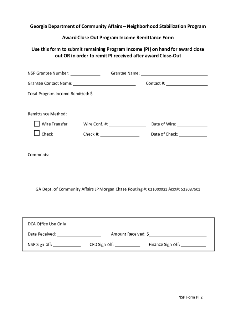 Georgia Department of Community Affairs Neighborhood Stabilization Program Award Close Out Program Income Remittance Form Use this form to submit remaining Program Income (PI) on hand for award close