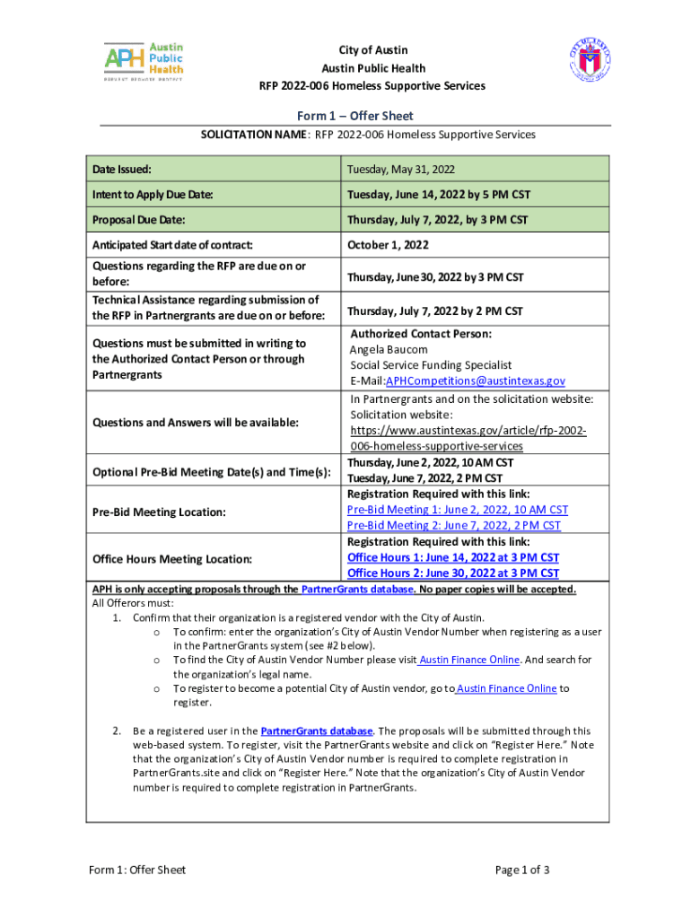 City of Austin Public Health RFP 2022006 Homeless Supportive ServicesForm 1 Offer SheetSOLICITATION NAME: RFP 2022006 Homeless Supportive Services Date Issued:Tuesday, May 31, 2022Intent to Apply