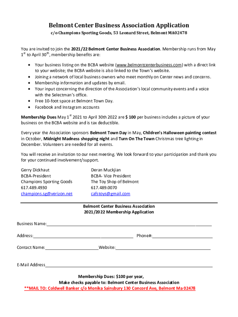 Belmont Center Business Association Application c/o Champions Sporting Goods, 53 Leonard Street, Belmont MA02478You are invited to join the 2021/22 Belmont Center Business Association. Membership