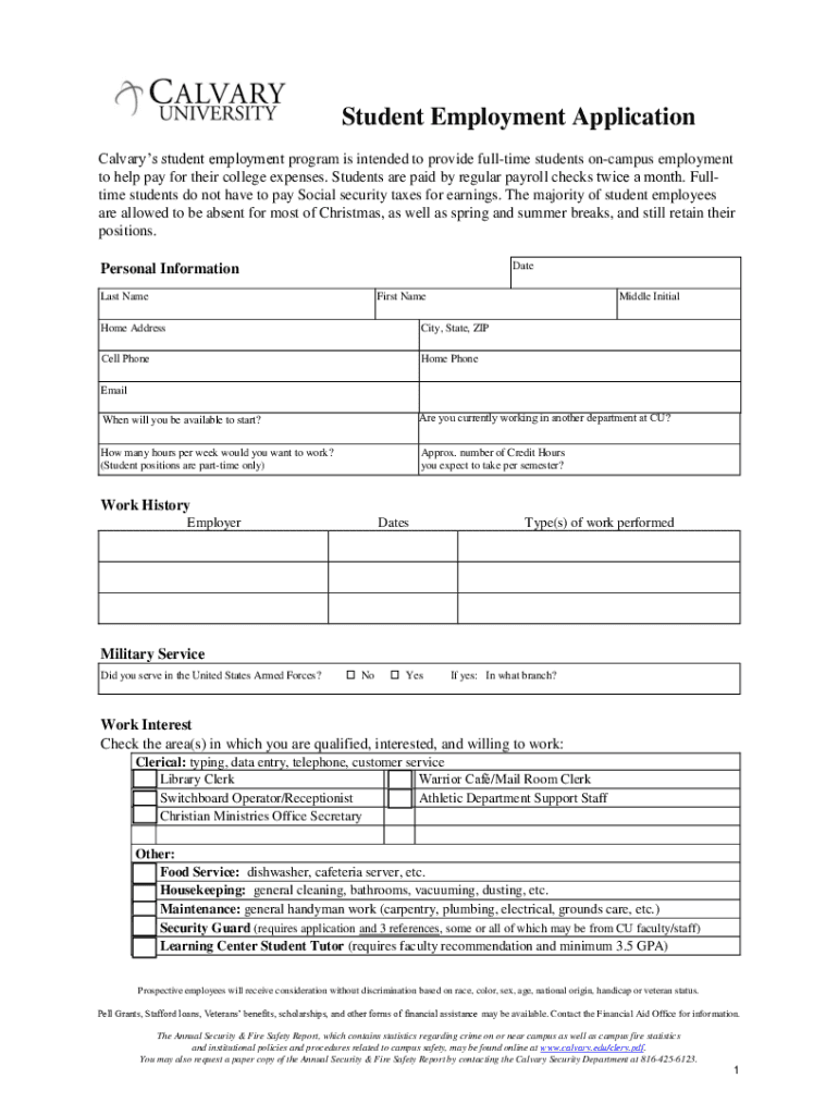 Student Employment Application Calvary's student employment program is intended to provide full time students on campus employment to help pay for their college expenses. Students are paid by regular