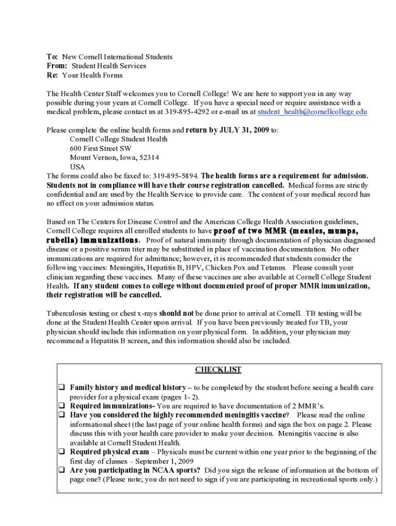To: New Cornell International Students From: Student Health Services Re: Your Health Forms The Health Center Staff welcomes you to Cornell College! We are here to support you in any way possible during