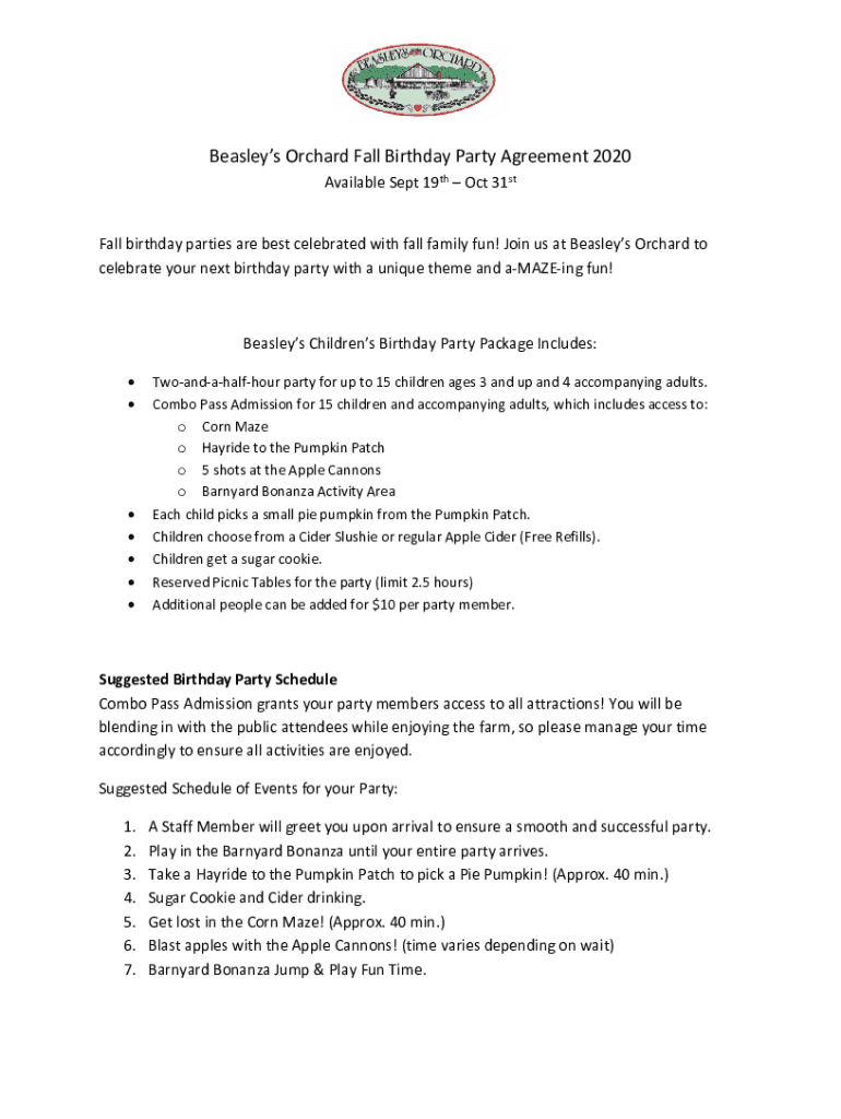 Get the free Beasleys Orchard Fall Birthday Party Agreement 2020