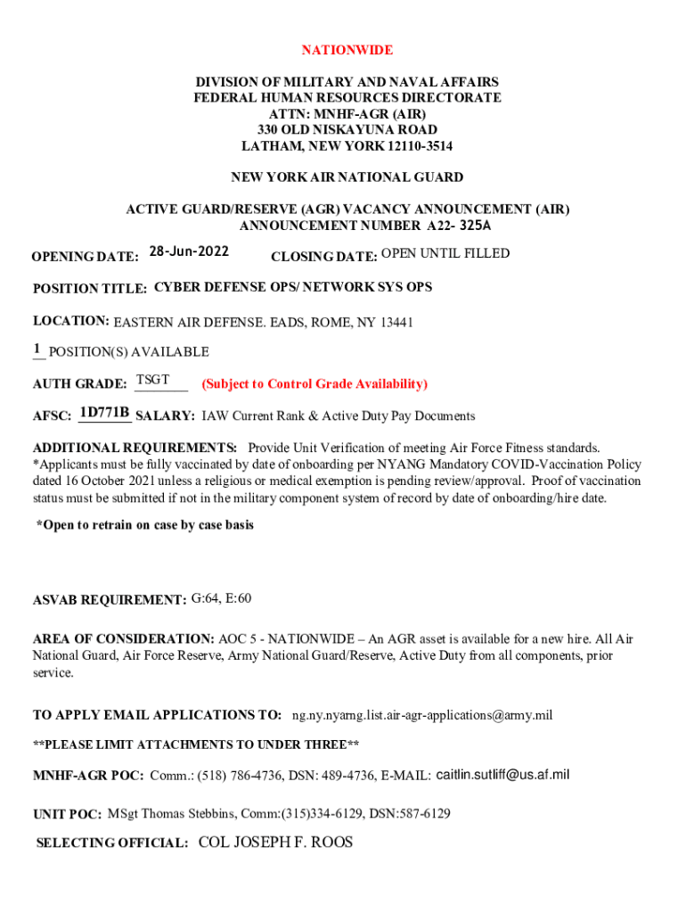 NATIONWIDE DIVISION OF MILITARY AND NAVAL AFFAIRS FEDERAL HUMAN RESOURCES DIRECTORATE ATTN: UNFAIR (AIR) 330 OLD NISKAYUNA ROAD LATHAM, NEW YORK 121103514 NEW YORK AIR NATIONAL GUARD ACTIVE GUARD/RESERVE
